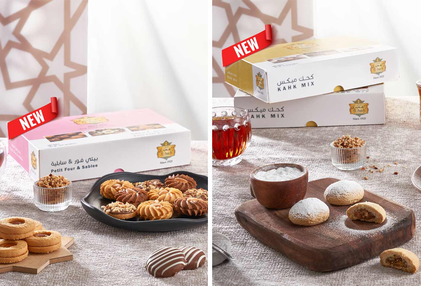 وتحتوي علبة “كحك ميكس” على تشكيلة مميزة من كعك (بندق – ملبن – تمر – عين جمل – مكسرات “لوز وبندق”)، كما تحتوي علبة “بيتي فور & سابليه” على ميكس من السابليه وبيتي فور الفانيليا والشوكولاتة؛ لترضي احتياجات عملائها.