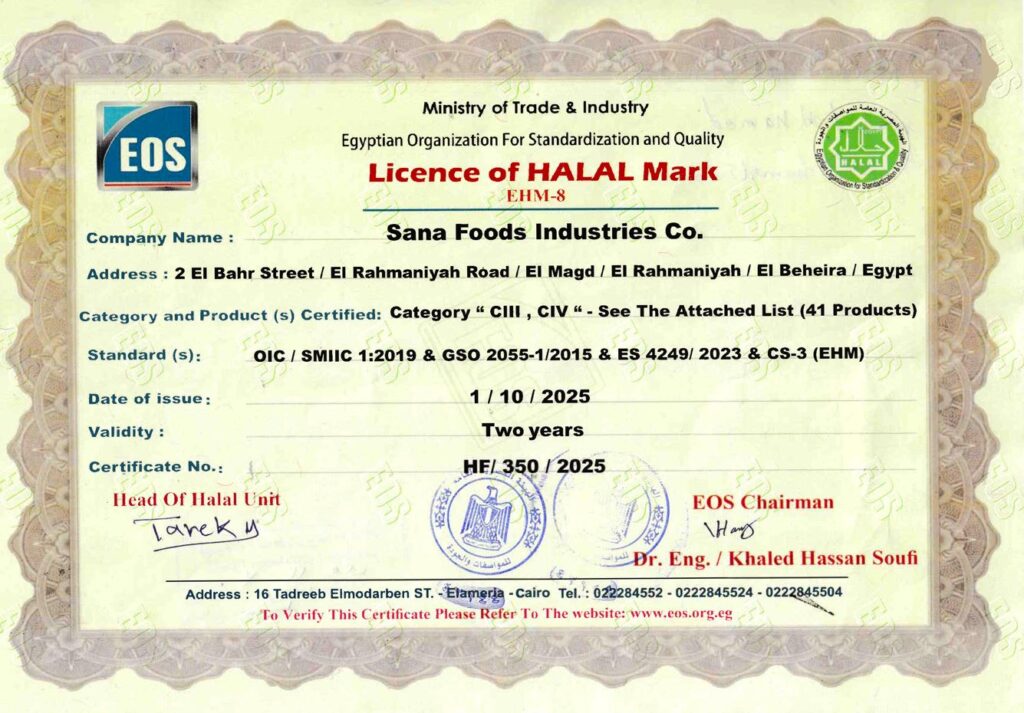 سنا فودز تحصل على شهادة “حلال” من الهيئة المصرية العامة للمواصفات والجودة (EOS)