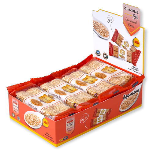 حلوى مقرمشة مدهشة تجمع بين حبات السمسم المحمص والكراميل الذهبي الشهي، مع لمسة من الفانيلا الطبيعية. تحتوي العلبة على 12 بار، يحتوي البارالواحد على (165) سعر حراري، ويبلغ وزنه (30) جرام. يبلغ وزن العلبة (400) جرام.