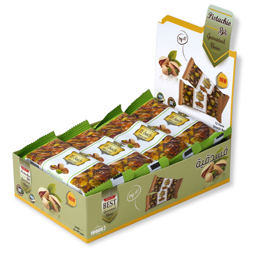 حلوى مقرمشة فاخرة تجمع بين حبات الفستق المحمصة والكراميل الذهبي اللذيذ، مع لمسة من الفانيلا الطبيعية. تحتوي العلبة على 12 بار، يحتوي البار الواحد على (185) سعر حراري، ويبلغ وزنه (33) جرام. يبلغ وزن العلبة (430) جرام.