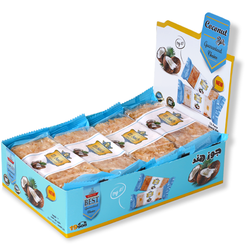 حلوى لذيذة محضرة من جوز الهند المحمص ممزوجًا بالكراميل الشهي مع الفانيلا والعسل النقي. تحتوي العلبة على 12 بار، يحتوي البارالواحد على (220) كالوري، ويبلغ وزنه (45) جرام، يبلغ وزن العلبة (570) جرام.