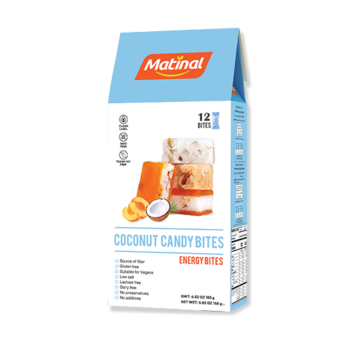 ميكس مميز من حلوى جوز هند وحلوى قمر الدين بجوز الهند، الممزوجة بالزبيب الطازج والمكسرات المحمصة. تحتوي العلبة على 12 قطعة، تحتوي القطعة الواحدة من حلوى جوز الهند على (50) سعر حراري وتزن (11)جرام، بينما تحتوي القطعة الواحدة من حلوى قمر الدين بجوز الهند على (80) سعر حراري وتزن (19) جرام. يبلغ وزن العلبة (185) جرام.