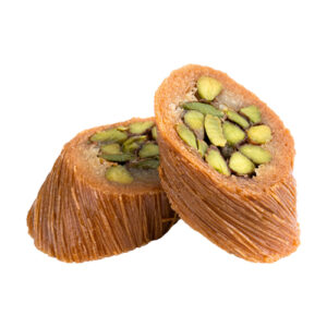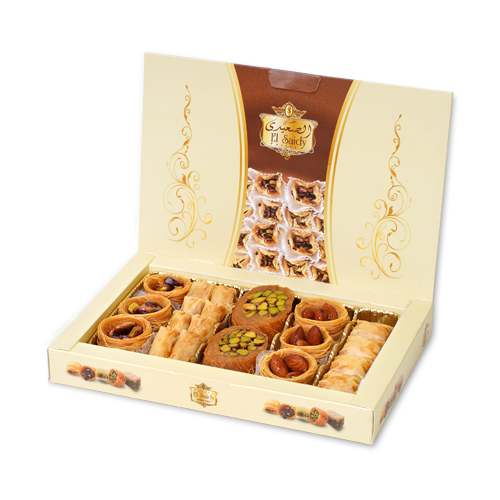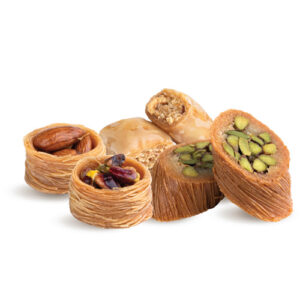 علبة تحتوي على تشكيلة رائعة من الحلويات العربية الكلاسيكية الأصيلة مصنعة بدقة فائقة، تشمل ( بقلاوة كل واشكر - بقلاوة أصابع - كنافة عش فستق - كنافة عش لوز - كنافة بورمة فستق). تزن العلبة (250) جرام.