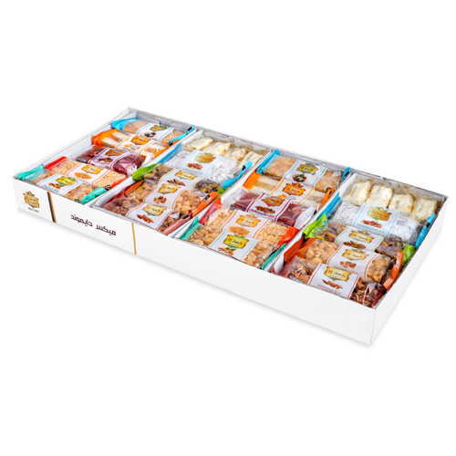 علبة منوعة من الحلوى الجافة والحلوى السوفت الفاخرة مصنعة على أعلى جودة، تزن العلبة (2000) جرام، وتحتوي على (46) قطعة. تحتوي على (بار فستق - بار بندق - بار لوز - بار سوداني - بار حمص - بار سمسم - نواعم حمص - نواعم سوداني - دومية مكسرات - حلوى قمر الدين بجوز الهند - ملبن عين جمل - ملبن جيلي فراولة - ملبن جيلي برتقال - حلوى جوز هند - حلوى جوز هند كراميل - نوجا سوداني- مارشيملو).