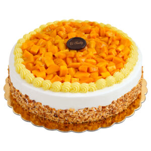 Vanilla cake layers, filled with fresh heavy cream and mango filling, topped with fresh mango pieces, with almonds decoration. ..Read more